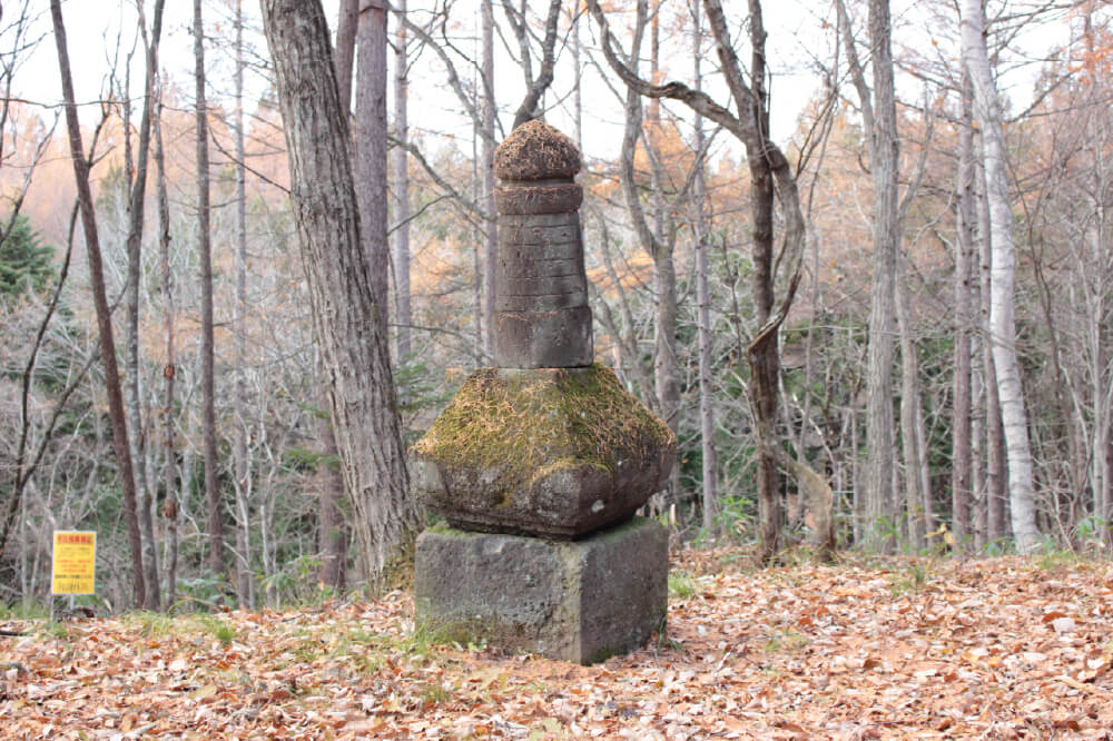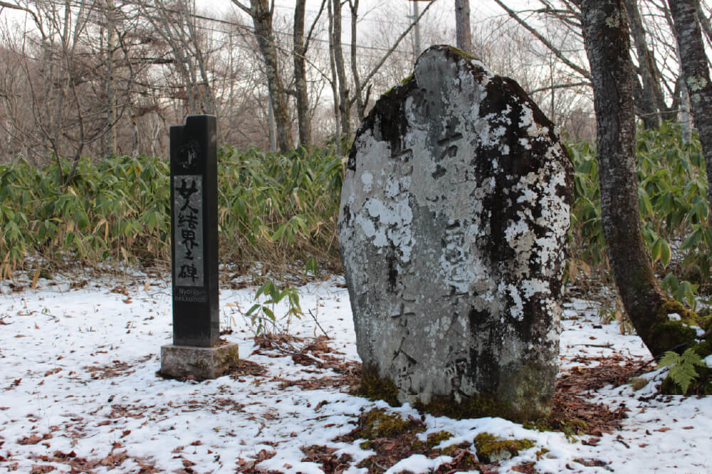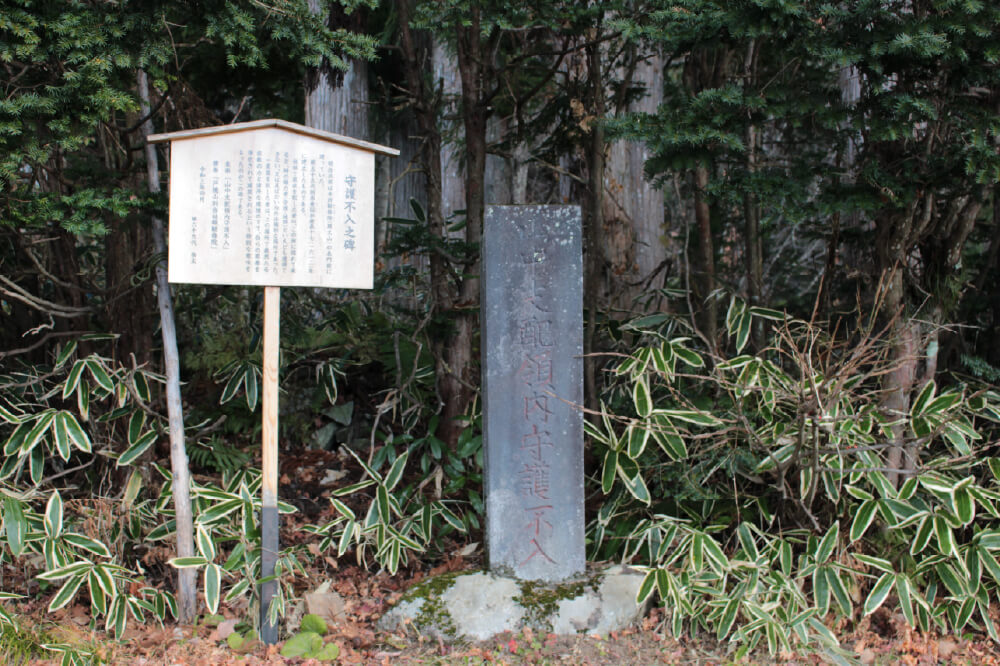 寛政7年(1795年)、女人禁制だった奥社へ女性が向かうことがないよう建てられた大きな自然石です。道標の役割をしています。