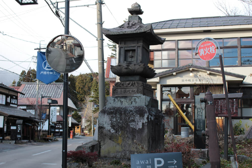 江戸時代まで天台宗の寺院だったため、奥社一帯は女人が入ることを禁じられていました。ここには女性が参拝するためのお堂がありました。また、越後方面へ行く女性は、ここから右側の道を通るよう定められていました。