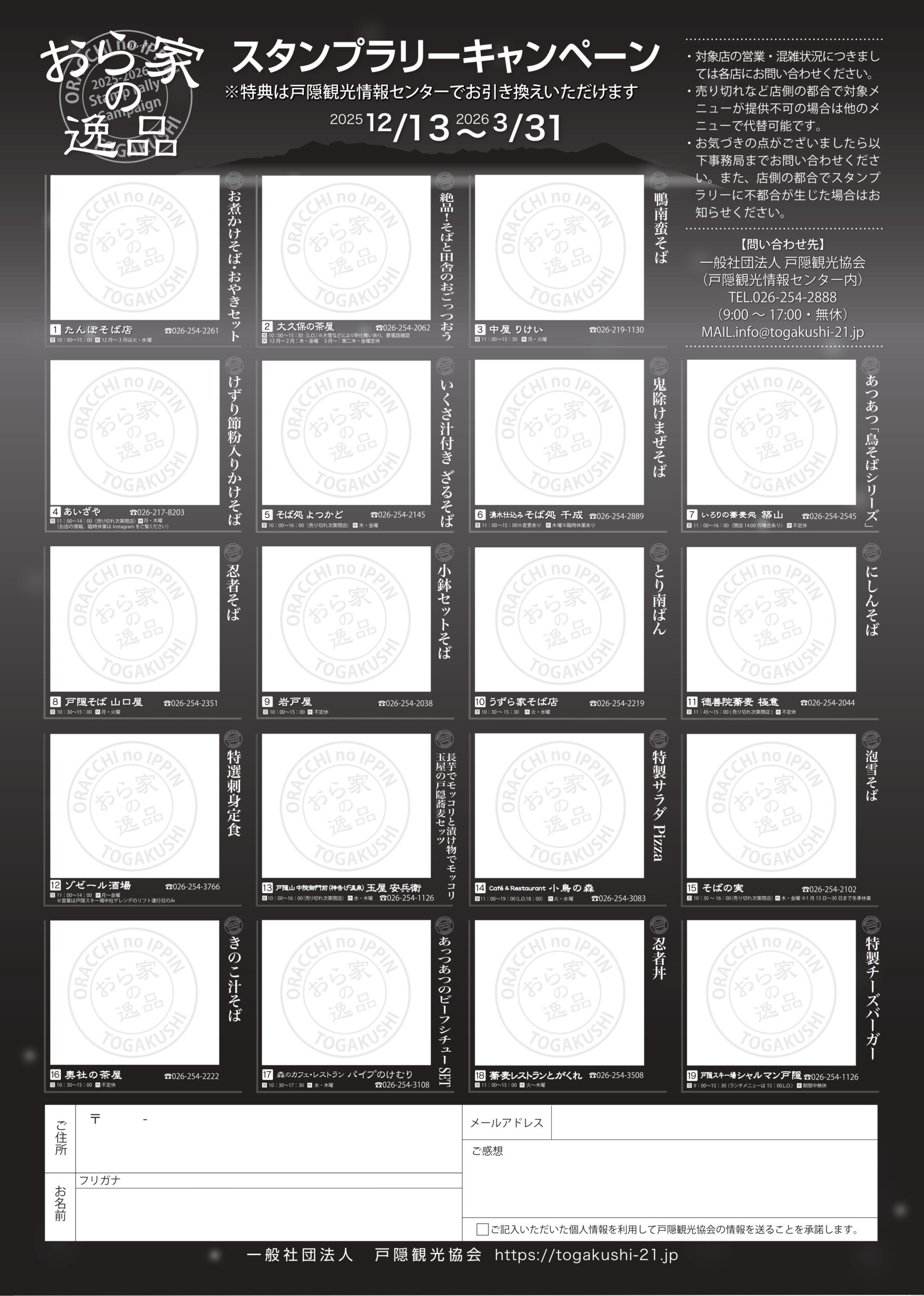 参加飲食店または戸隠観光情報センターでチラシ(スタンプ台紙)を入手