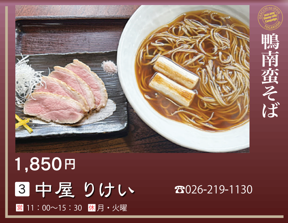 【対象メニュー】鴨南蛮そば(1,850円)