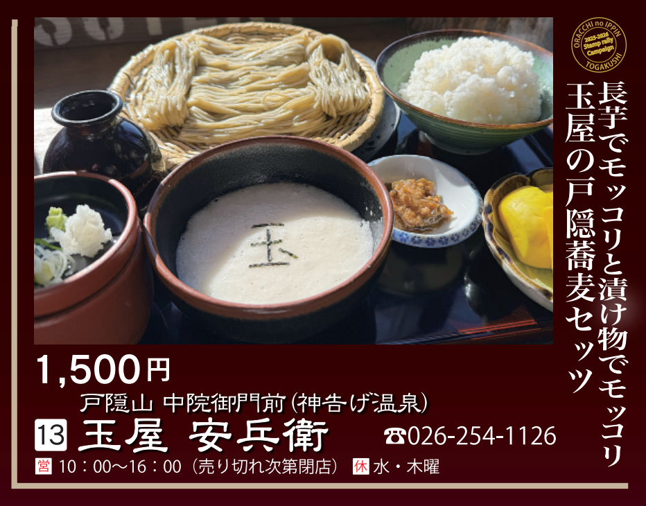 【対象メニュー】長芋でモッコリと漬け物でモッコリ 玉屋の戸隠蕎麦セッツ(1,500円)