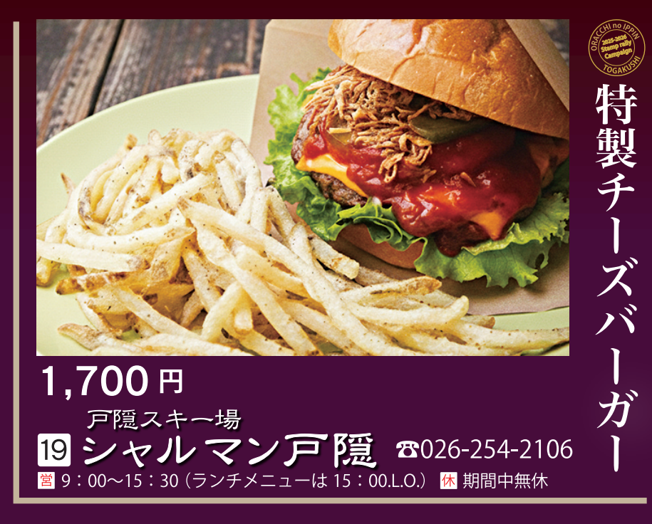 柔らかいバンズとジューシーなパティにクリーミーなチーズを合わせたボリューム満点の人気メニューです。スキー場からの景色と共にお楽しみください。スタンプは軽食カウンターにて押印いたします。