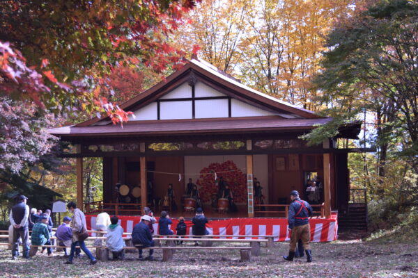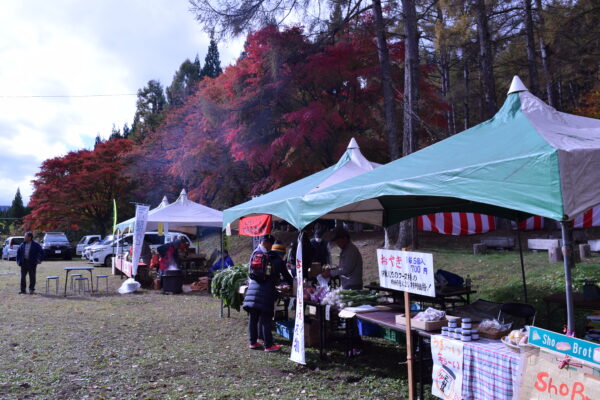 神事後は、キャンプ場内の能舞台にて祭典がある他、別途ウォーキングツアーも実施。会場ではおやきやきびおこわ、地元の野菜を販売します。