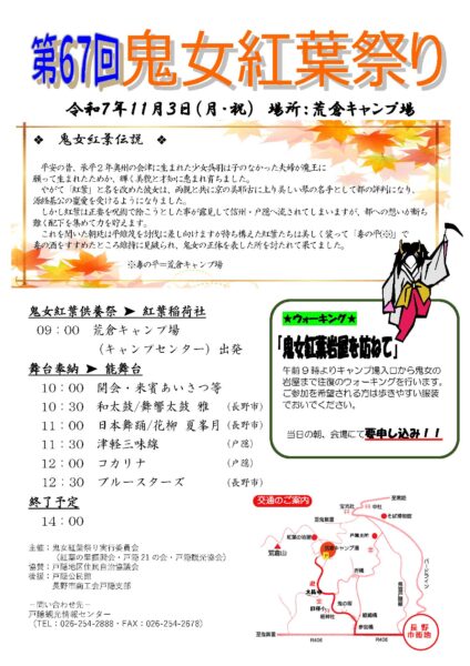 鬼女紅葉を偲ぶ「第67回鬼女紅葉祭り」が11月3日(日)、荒倉キャンプ場にて開催されます。