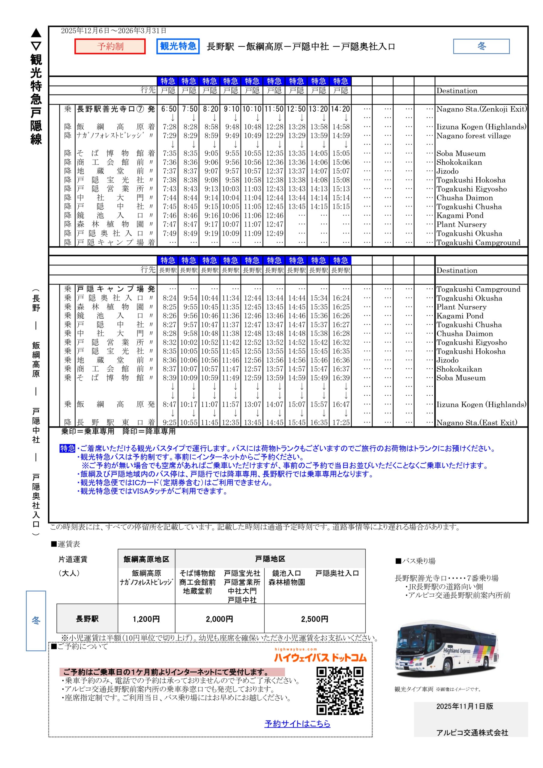 戸隠行きの観光特急バス・路線バスは、2025年12月6日~2026年3月31日の間、冬季ダイヤとなります。