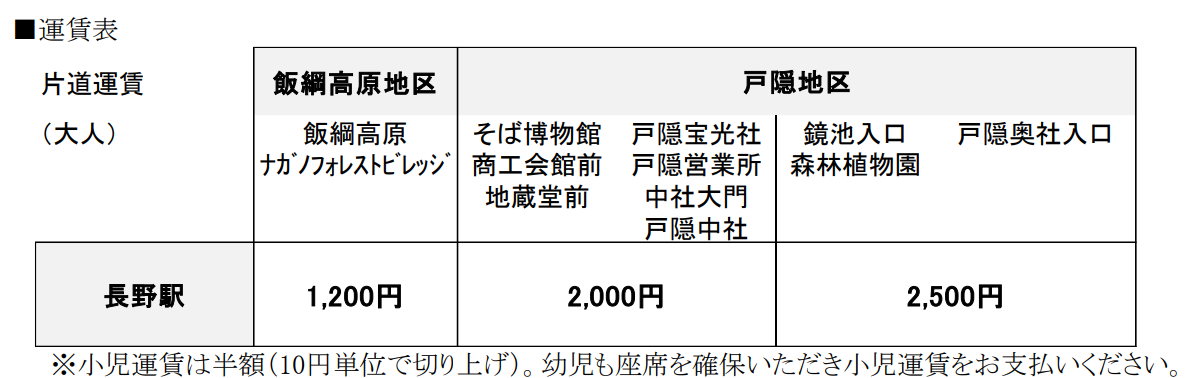 ・飯綱及び戸隠地域内のバス停は、戸隠行では降車専用、長野駅行では乗車専用となります。